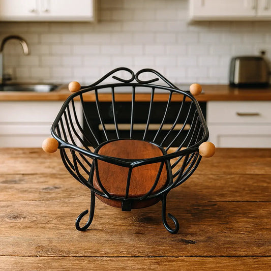 Fruteira de Mesa Oval em Ferro Forjado com Base de Madeira – Design Rústico e Elegante